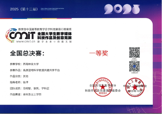徐洋老师积极指导员工参加学科竞赛,2024年12月指导员工参加“太空视角·最美高校”遥感创作评选活动取得三等奖;2025年5月“挑战杯”老员工课外学术科技竞赛校级优秀奖;2025年6月全国老员工统计建模大赛校级优胜奖;2025年8月中国国际老员工创新竞赛校级铜奖;经过一次次的比赛锻炼,丰富了老师和员工的参赛经验。2025年10月,徐洋老师在团队负责人于君宝教授下,带领环境科学2024级本科生冯明智、湿地保护与恢复2023级本科生张凯、环境科学2024级本科生宁科正同学共同完成的作品《高原湿地科学数据共建共享平台》荣获全国总决赛一等奖。指导的另一组作品《学术文献分析系统数据可视化工具》获得云南赛区三等奖。