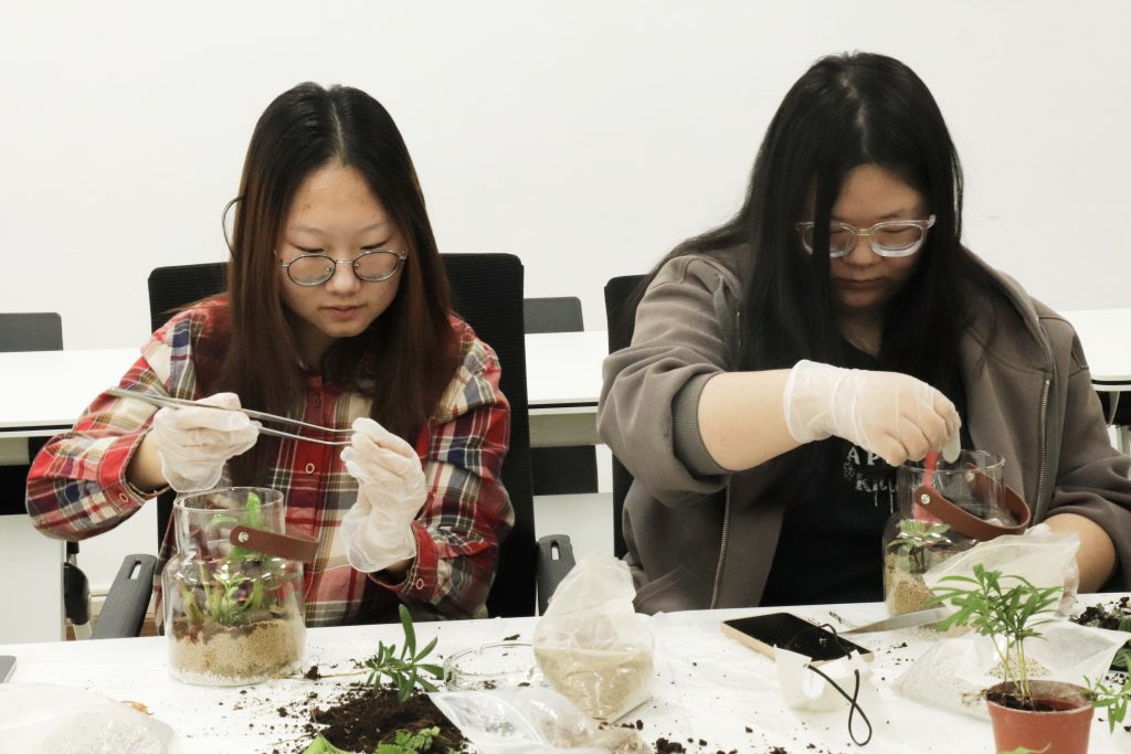 活动现场,李壹向大家讲解了生态造景的理念、技巧和注意事项,并亲自示范如何将苔藓、植物、砂石等元素巧妙搭配,打造出微缩的自然景观。参与活动的女同学们纷纷化身“造景师”,发挥自己的创意和想象力,将心中的自然美景呈现在小小的玻璃容器中。经过两小时的精心雕琢,同学们制作出20个风格迥异的生态造景作品。