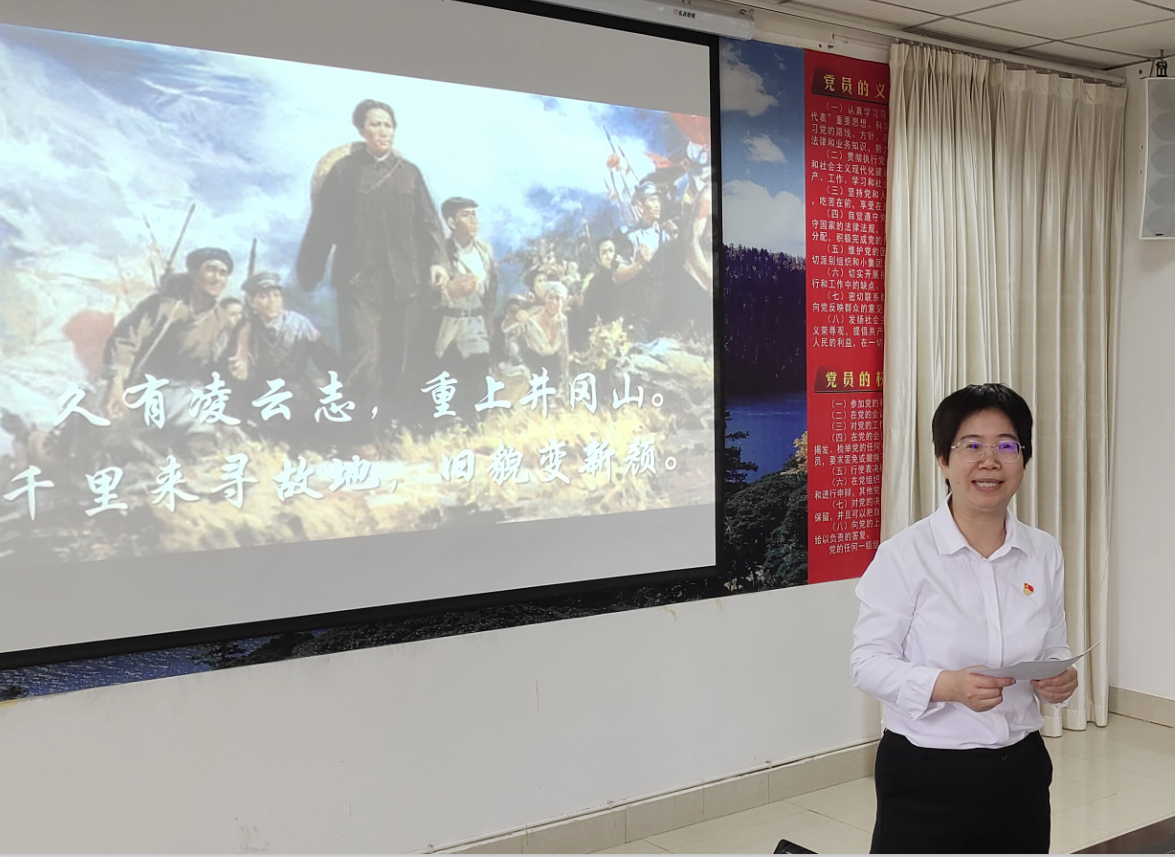 其中,熊好琴老师朗诵了毛泽东同志的《水调歌头·重上井冈山》,表演慷慨激昂,富有感召力,并配以恰到好处的背景音乐,将朗诵与表演融为一体,抒发了自己对祖国和党的赞颂,获得了在座老师的阵阵掌声。