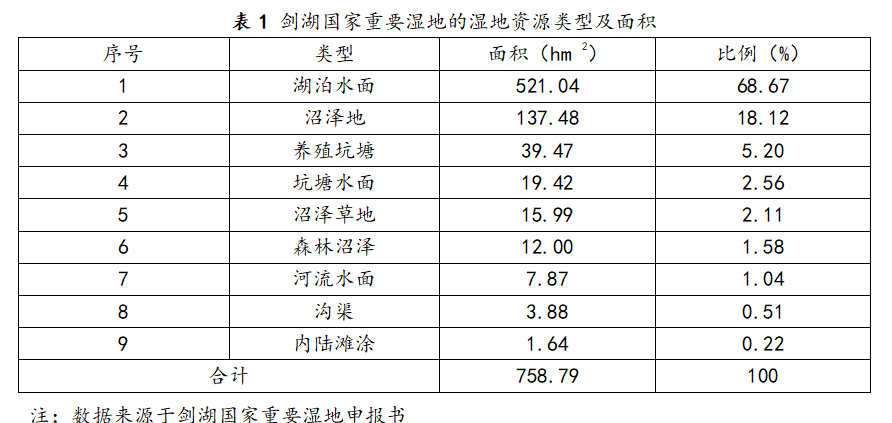按《中华人民共和国湿地保护法》,剑湖国家重要湿地的湿地资源包括9个类型,总面积758.79 hm2,集中分布在剑湖周边,以湖泊水面和沼泽湿地为主。